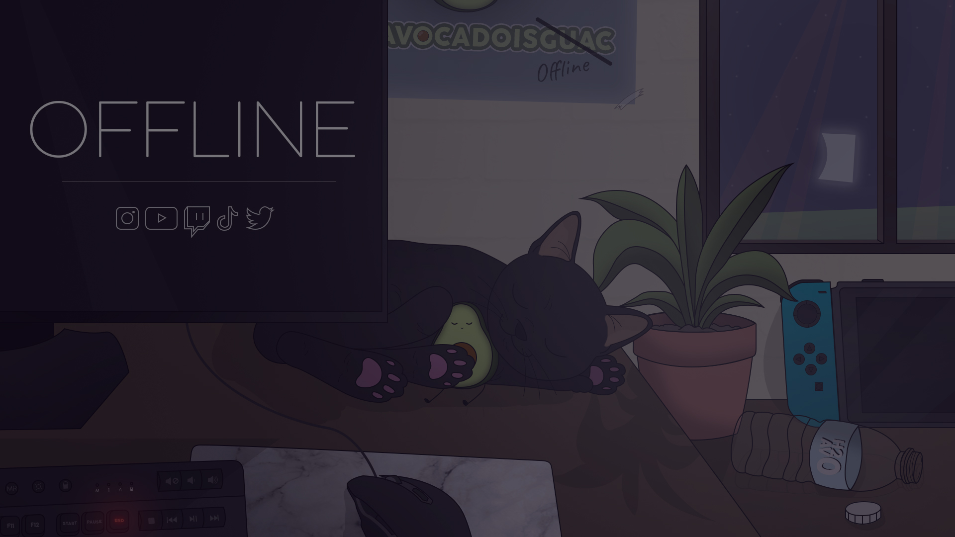 A gaming/variety streamer on the platform 'Twitch'. The theme and colours of an avocado were important to be used in the designs. Starting soon animation was meant to incorporate the streamers setup they use, but also their cat. Apart from these bulletpoints, I had free reign over the overall branding of the title AvocadoIsGuac.
